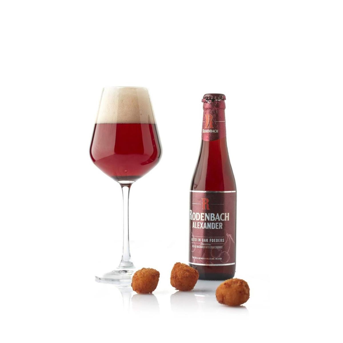 Questa crocchetta è aromatizzata con la famosa birra belga Rodenbach Alexander, considerata una delle migliori birre acide prodotte dal birrificio. E' realizzata con la tecnica della "fermentazione mista", cioè da una miscela composta dal33% di birra giovane macerata in amarene ed il 66% di birra maturata per 12 mesi in botti di rovere. Bilanciata nei sentori, si percepiscono note acidule di frutta e note di legno.