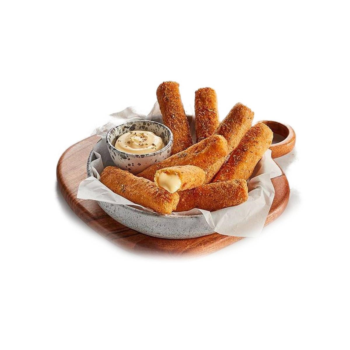 Bastoncini di formaggio Cheddar avvolti da una panatura croccante e dorata, prefritti e surgelati.