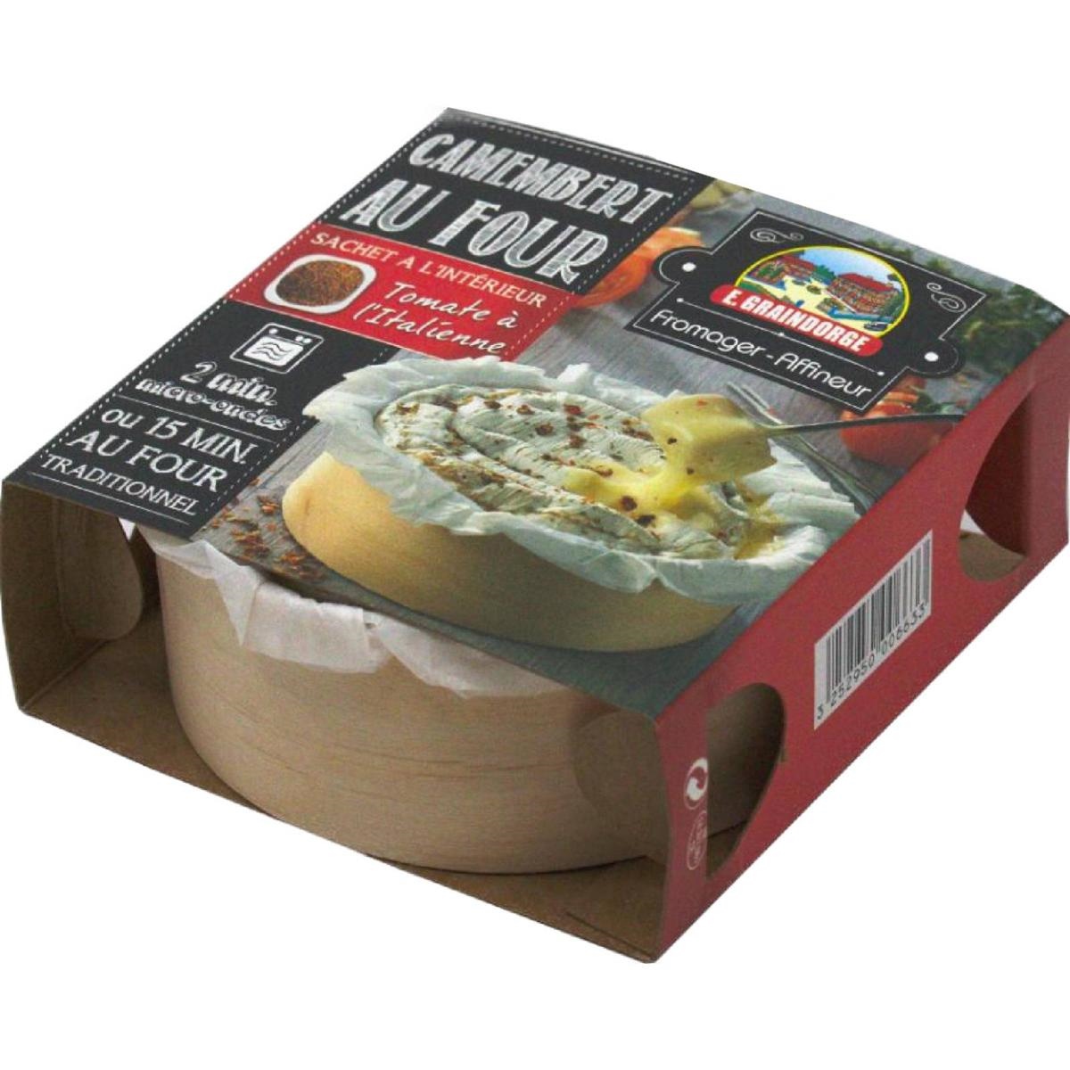 Camembert di latte vaccino da cuocere al forno, cosparso di spezie, al pomodoro, pronto all'uso.