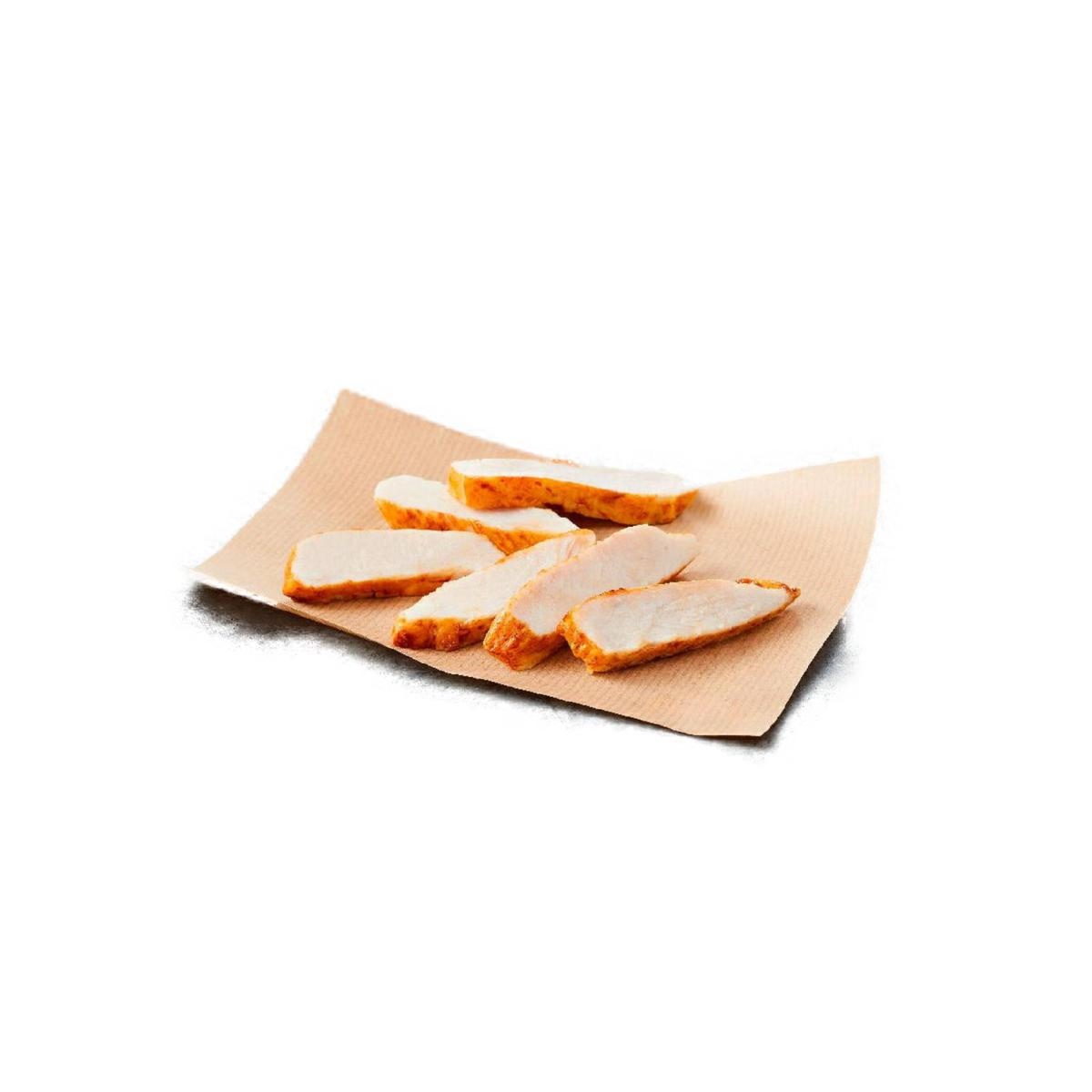 Fettine di petto di pollo arrosto, marinate, cotte e surgelate.
