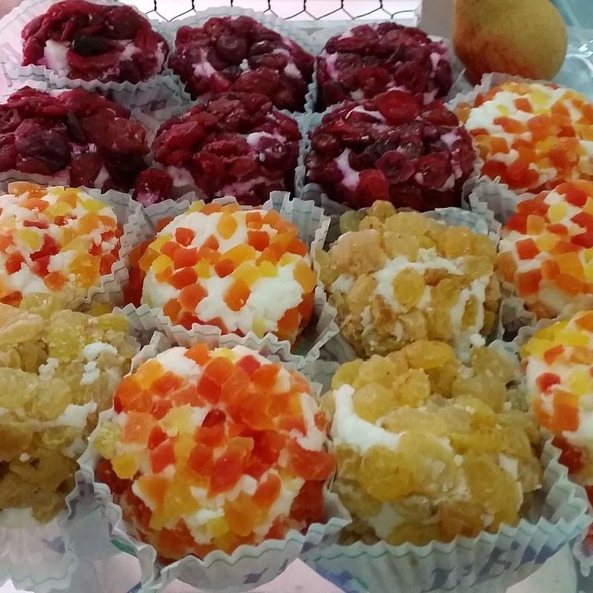 Vassoio snacking assortimanto di bocconcini di formaggio di capra dolci e salati con dragoncello, curry, pepe, paprika dolce, peperone dolce, ananas, papaya e albicocca