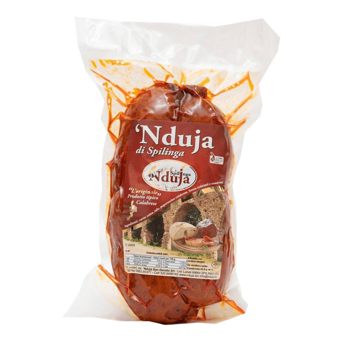 La ‘Nduja di Spilinga Cresponetto è una prelibatezza calabrese dal gusto deciso, racchiusa in un budello naturale che conserva al meglio il suo aroma intenso e la sua morbidezza spalmabile. Preparataseguendo la tradizione di Spilinga, questa ‘nduja viene insaporita con peperoncino calabrese, che le conferisce una piccantezza inconfondibile.