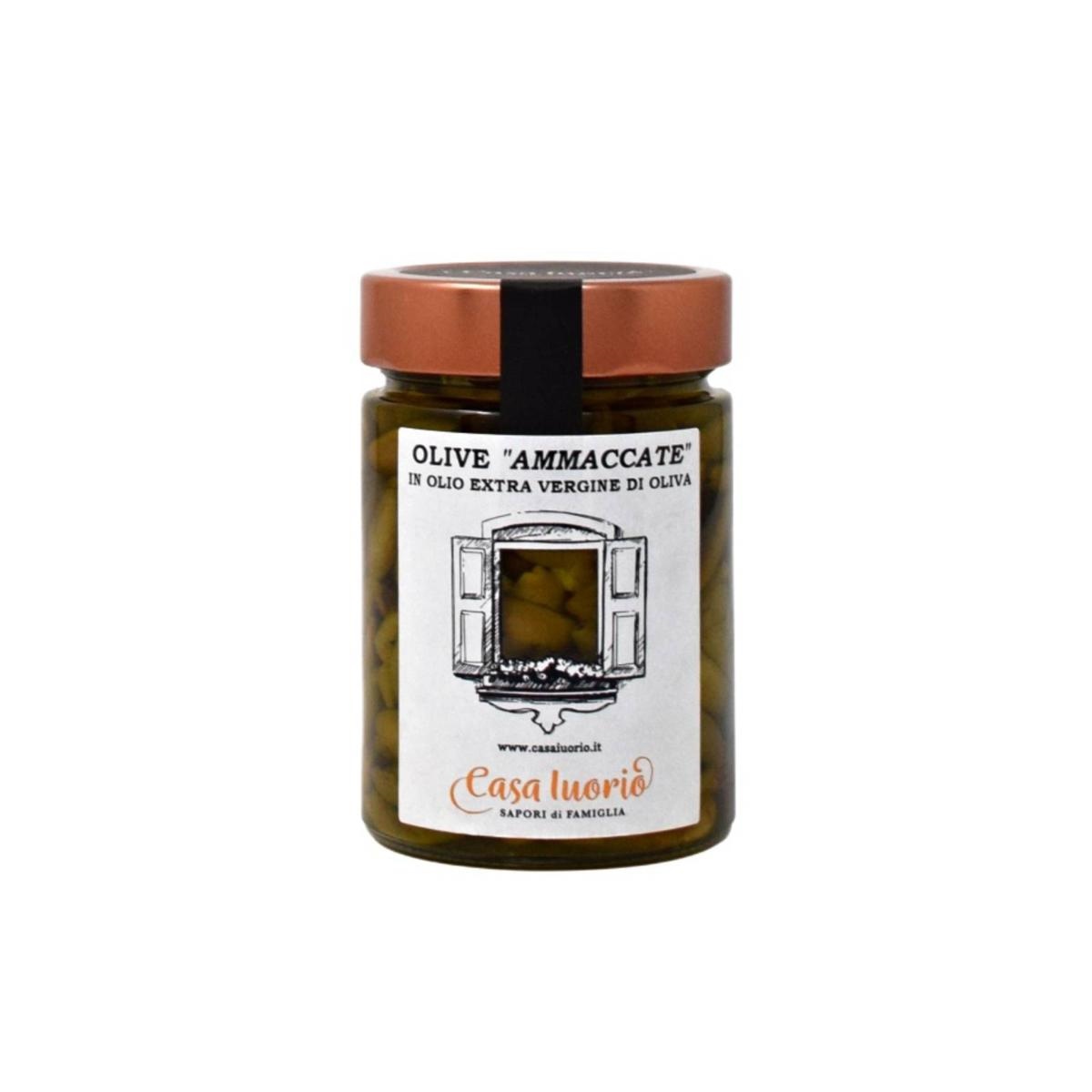 Olive piccolissime varietà Don Carlo schiacchiate a mano da antica ricetta, condite con olio, origano, aglio e peperoncino.