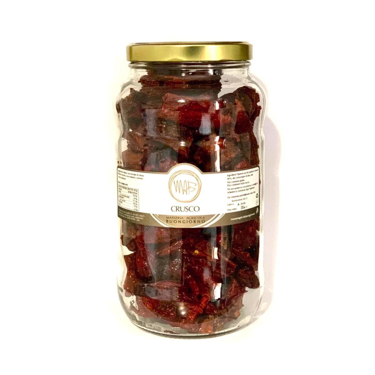 ?Il Peperone di Senise IGP, una volta fatto essiccare, viene selezionato e lavorato a mano per poi essere fritto in olio extravergine di oliva, salato e confezionato in vasi in vetro che ne lasciano invariate le qualità organolettiche tipiche del “crusco” Non necessita di cottura e può essere utilizzato come semplice chips per accompagnare i tuoi aperitivi, come condimento per arricchire un primo piatto che sia di carne o di pesce o come contorno.