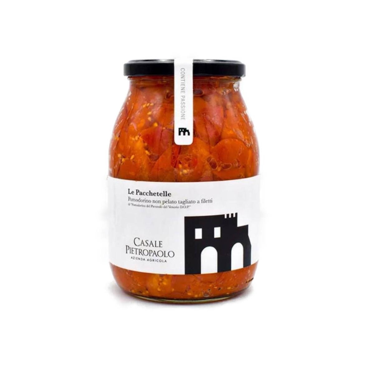 La tradizionale conserva Vesuviana. Una volta maturo “il Pomodorino del Piennolo del Vesuvio D.O.P.” viene selezionato e raccolto manualmente, dopo un accurato lavaggio, é tagliato in due parti e schiacciato all’interno del vasetto fino a riempimento, infine pastorizzato per avere la freschezza del pomodorino estivo tutto l’anno.