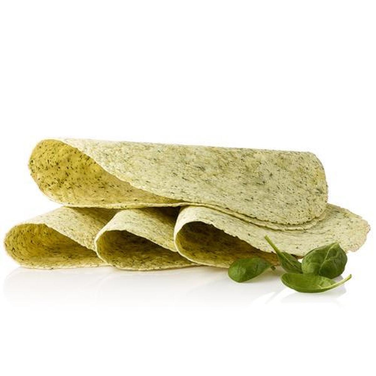 Tortillas messicane da 30 cm di diametro, aromatizzate agli spinaci. Ideali per creare originali wraps e burritos.
