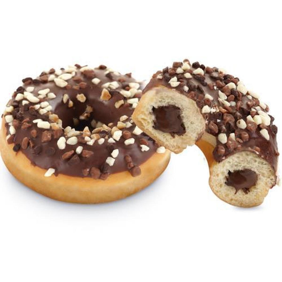 Donuts ripieni di crema al cioccolato guarniti da pepite di cioccolato bianco, fondente e al latte.